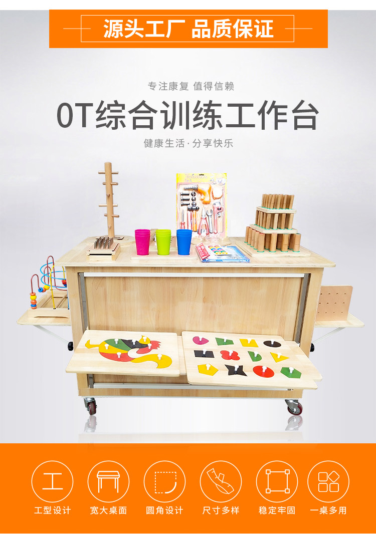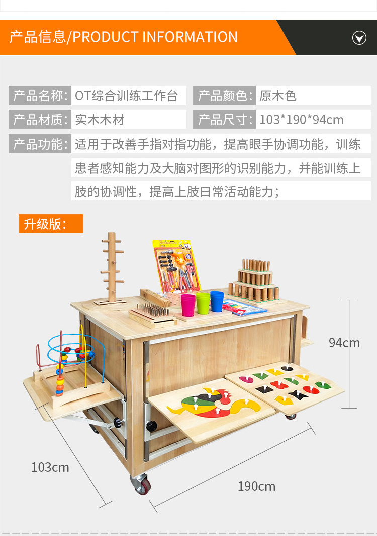 技术参数:操作台192×105×96㎝,左右操作台面44.5X36X2,后操作面板94.5X36X2;组件:上肢协调功能练习器(手指),分指板、分指板(弧形)、铁棍插板、木插板、套圈(立式)、几何图形插板、认知图形插板、模拟作业工具、上螺丝、上螺母、磁性纽。